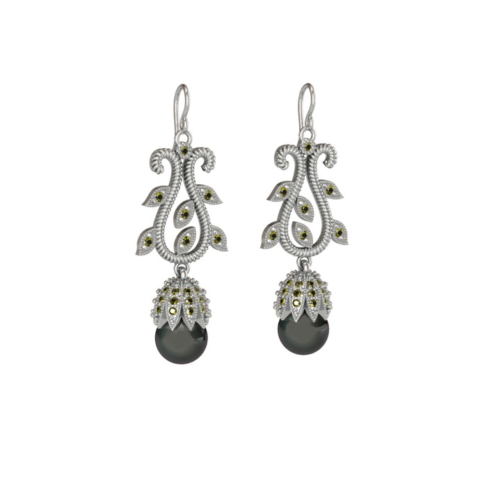 Siyah inci ve peridot 925 ayar gümüş küpe