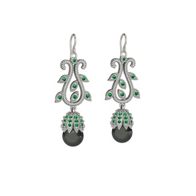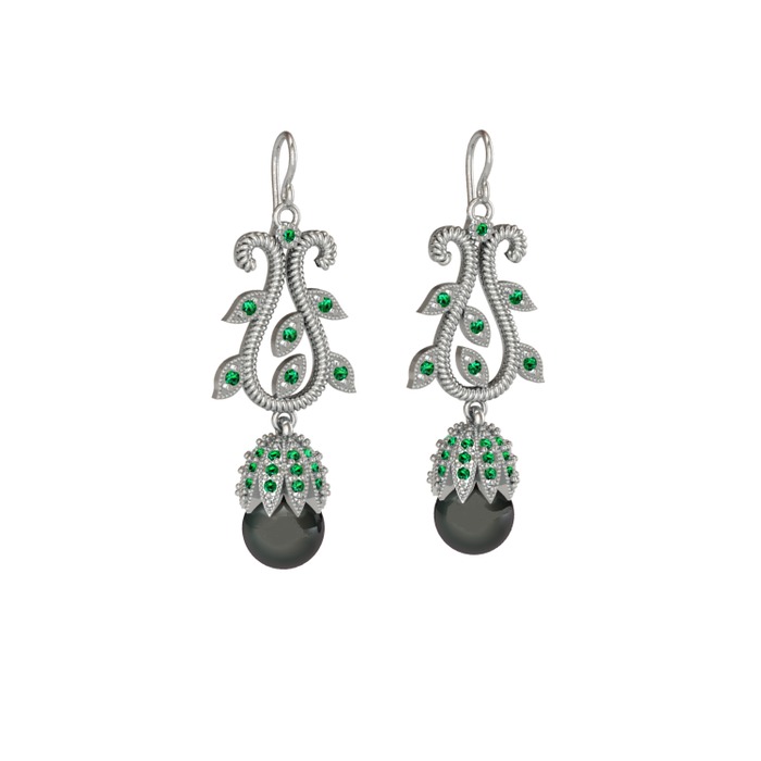 Siyah inci ve yeşil kuvars 8 ayar beyaz altın küpe