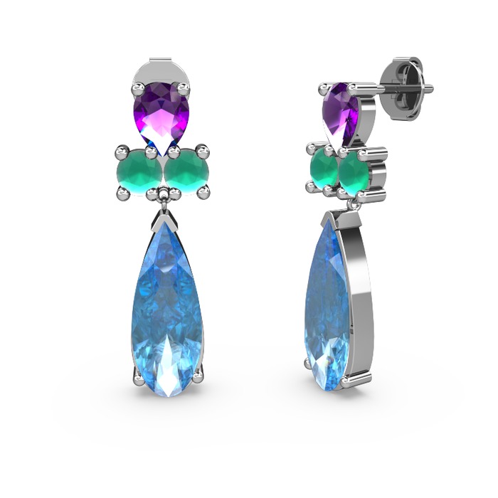 Akuamarin, ametist ve kök zümrüt 14 ayar beyaz altın küpe
