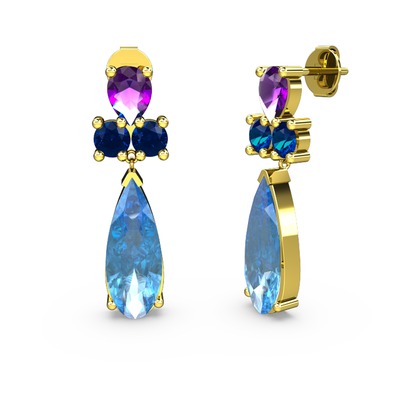 Akuamarin, ametist ve lab safir 18 ayar altın küpe