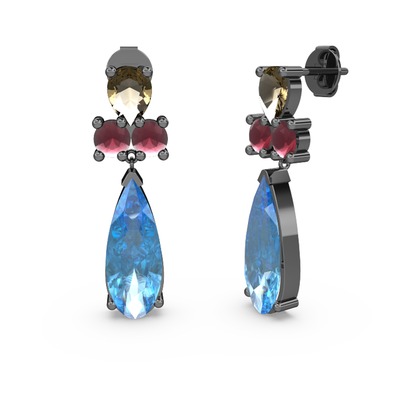 Akuamarin, dumanlı kuvars ve kök yakut 925 ayar siyah rodyum kaplama gümüş küpe