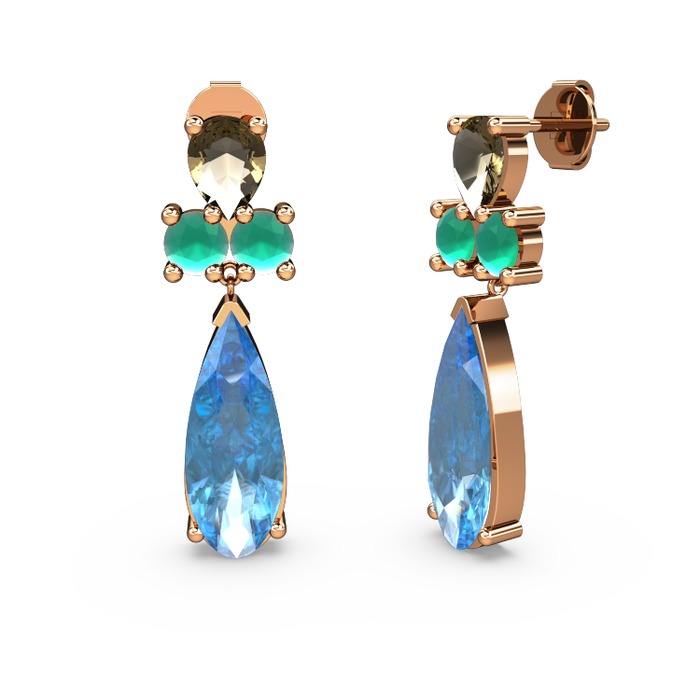 Akuamarin, dumanlı kuvars ve kök zümrüt 14 ayar rose altın küpe