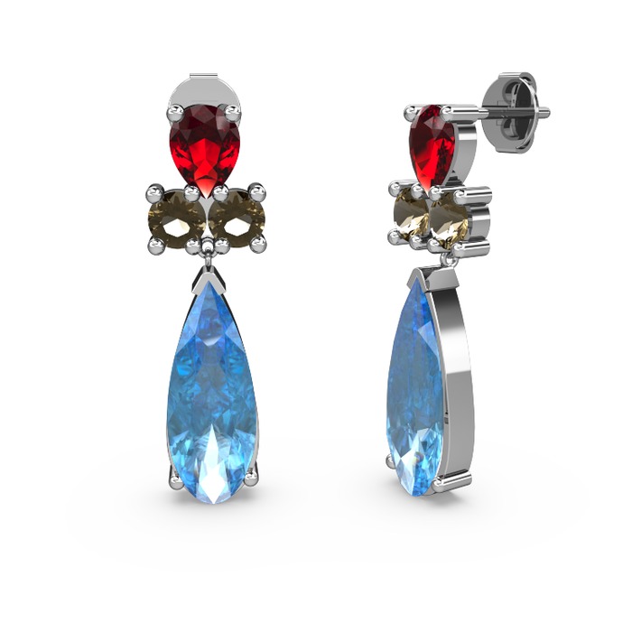 Akuamarin, garnet ve dumanlı kuvars 18 ayar beyaz altın küpe