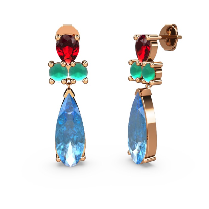 Akuamarin, garnet ve kök zümrüt 8 ayar rose altın küpe