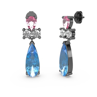 Akuamarin, pembe kuvars ve beyaz zirkon 925 ayar siyah rodyum kaplama gümüş küpe