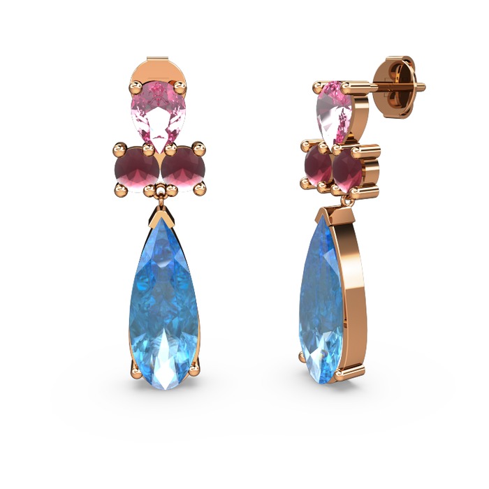 Akuamarin, pembe kuvars ve kök yakut 8 ayar rose altın küpe