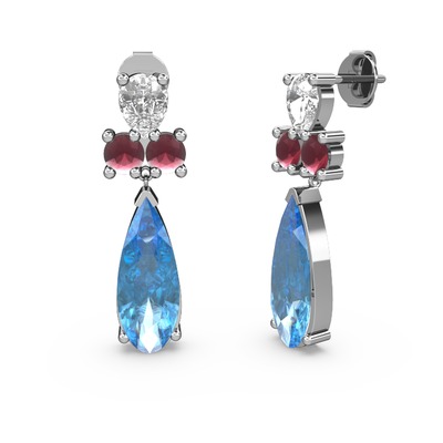 Akuamarin, swarovski ve kök yakut 14 ayar beyaz altın küpe