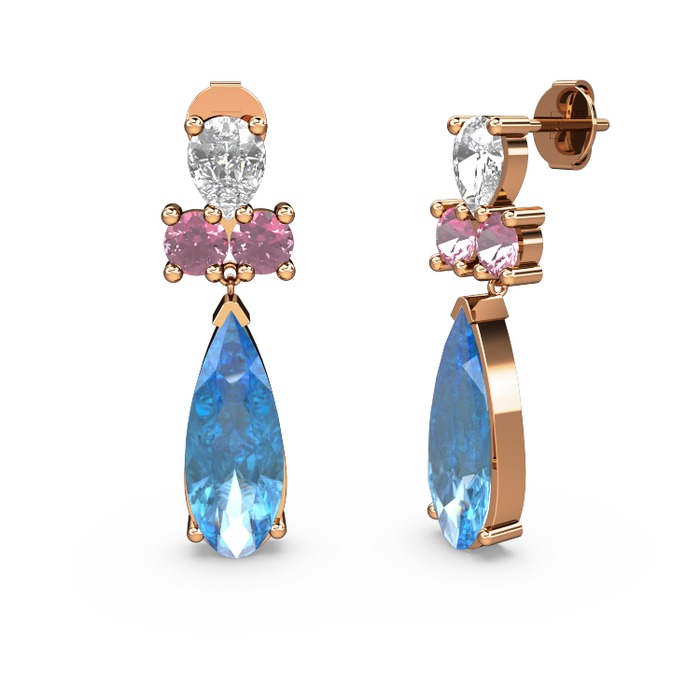 Akuamarin, swarovski ve pembe kuvars 925 ayar rose altın kaplama gümüş küpe