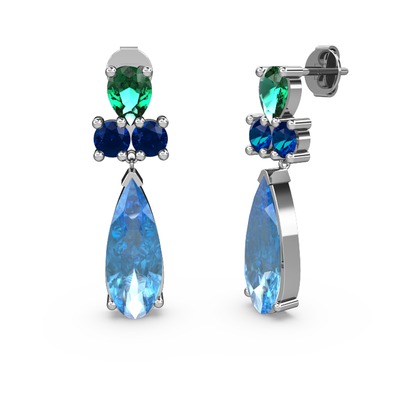 Akuamarin, yeşil kuvars ve lab safir 8 ayar beyaz altın küpe