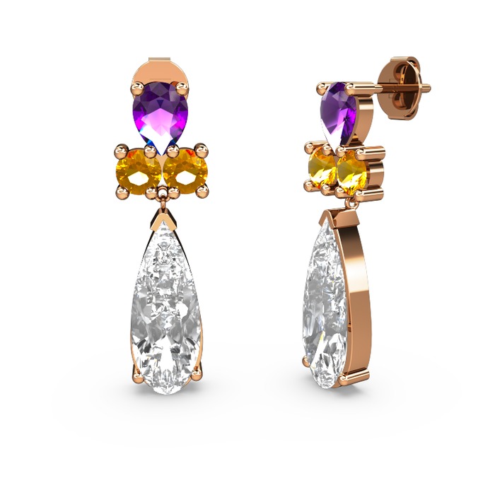 Beyaz zirkon, ametist ve sitrin 8 ayar rose altın küpe