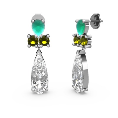 Beyaz zirkon, kök zümrüt ve peridot 8 ayar beyaz altın küpe