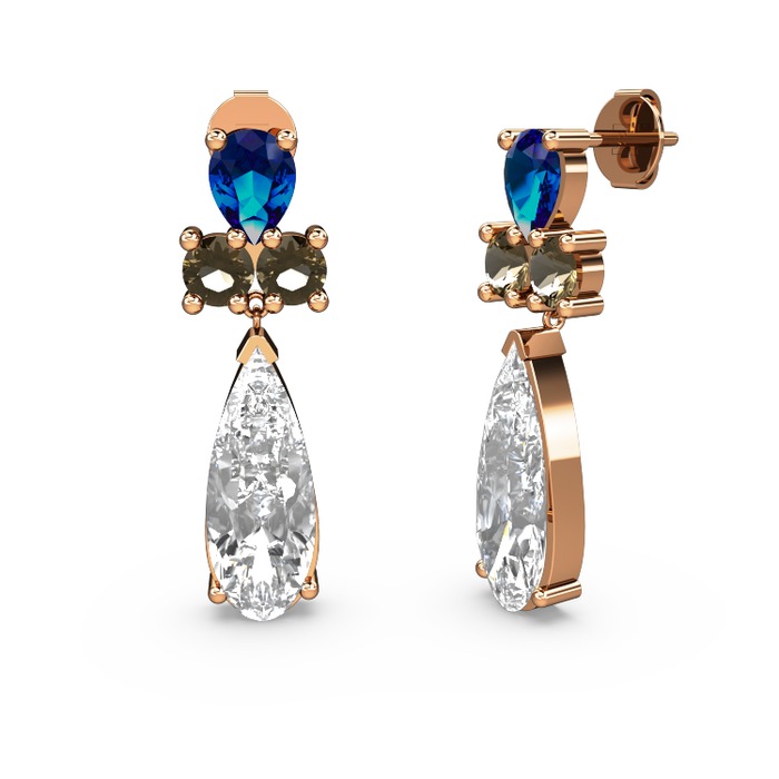 Beyaz zirkon, lab safir ve dumanlı kuvars 18 ayar rose altın küpe