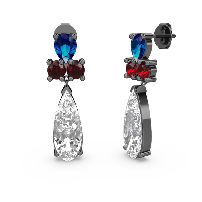 Beyaz zirkon, lab safir ve garnet 925 ayar siyah rodyum kaplama gümüş küpe