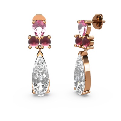 Beyaz zirkon, pembe kuvars ve kök yakut 8 ayar rose altın küpe