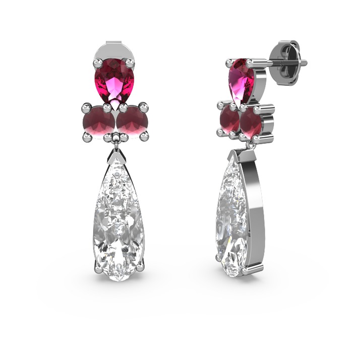 Beyaz zirkon, rodolit garnet ve kök yakut 14 ayar beyaz altın küpe