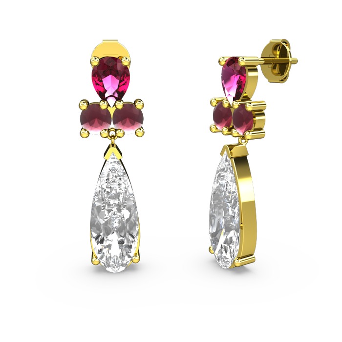 Beyaz zirkon, rodolit garnet ve kök yakut 8 ayar altın küpe