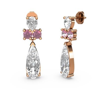 Beyaz zirkon, swarovski ve pembe kuvars 925 ayar rose altın kaplama gümüş küpe
