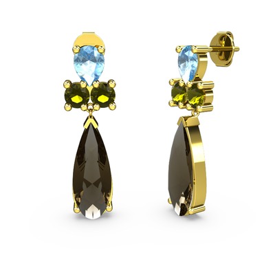 Dumanlı kuvars, akuamarin ve peridot 18 ayar altın küpe