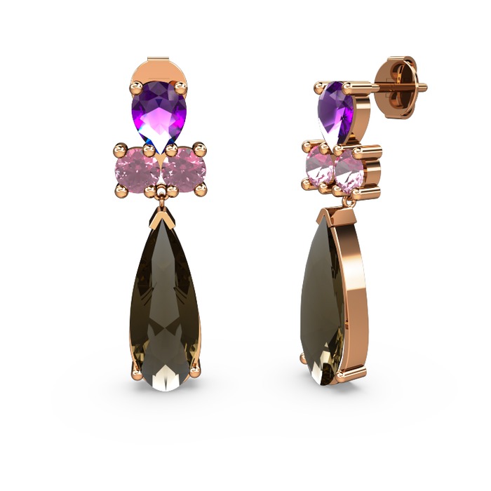Dumanlı kuvars, ametist ve pembe kuvars 18 ayar rose altın küpe