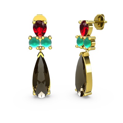 Dumanlı kuvars, garnet ve kök zümrüt 14 ayar altın küpe