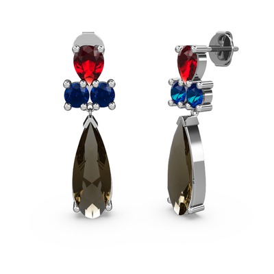 Dumanlı kuvars, garnet ve lab safir 14 ayar beyaz altın küpe