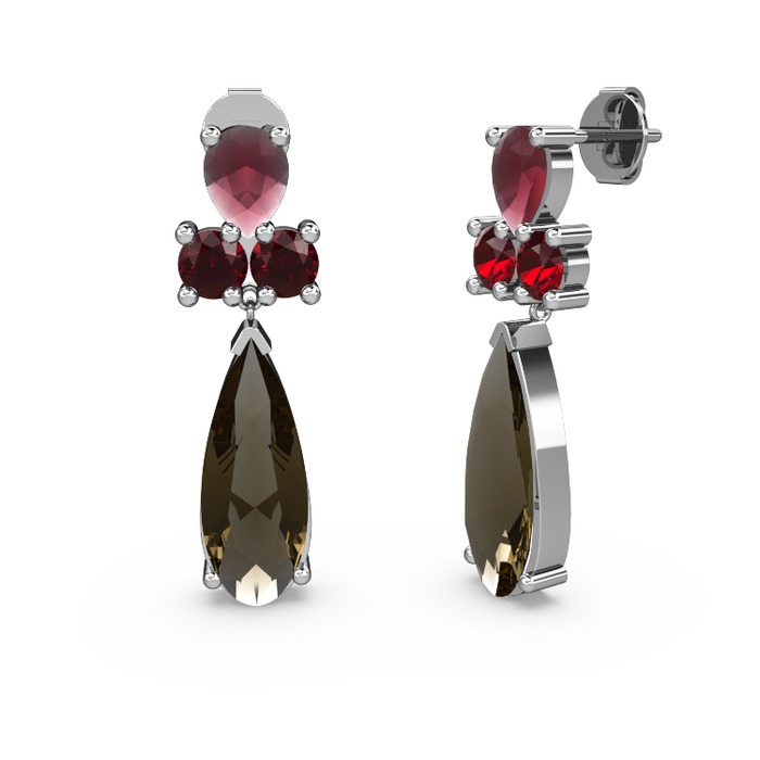 Dumanlı kuvars, kök yakut ve garnet 14 ayar beyaz altın küpe