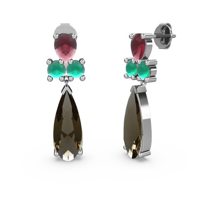 Dumanlı kuvars, kök yakut ve kök zümrüt 925 ayar gümüş küpe