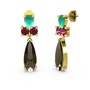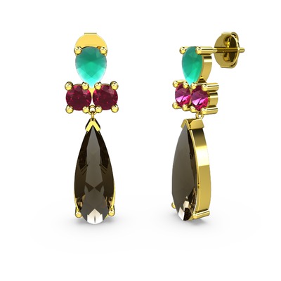 Dumanlı kuvars, kök zümrüt ve rodolit garnet 14 ayar altın küpe