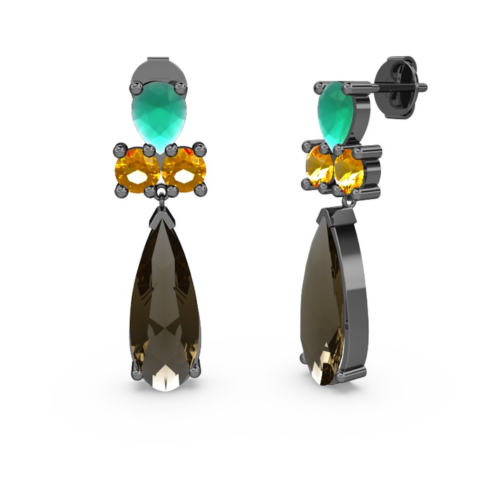 Dumanlı kuvars, kök zümrüt ve sitrin 925 ayar siyah rodyum kaplama gümüş küpe