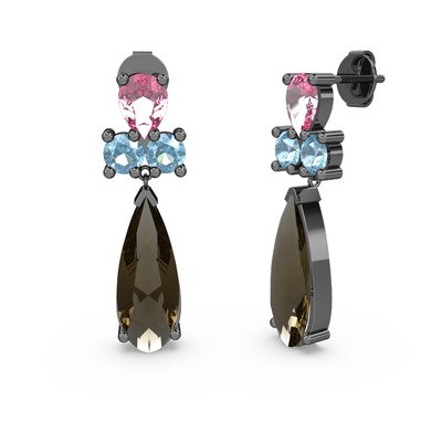 Dumanlı kuvars, pembe kuvars ve akuamarin 925 ayar siyah rodyum kaplama gümüş küpe