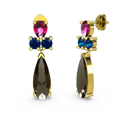 Dumanlı kuvars, rodolit garnet ve lab safir 8 ayar altın küpe