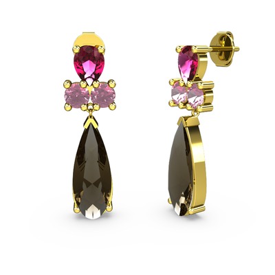 Dumanlı kuvars, rodolit garnet ve pembe kuvars 925 ayar altın kaplama gümüş küpe