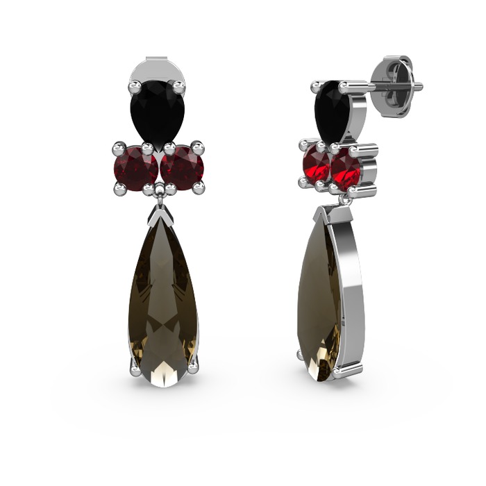 Dumanlı kuvars, siyah zirkon ve garnet 8 ayar beyaz altın küpe