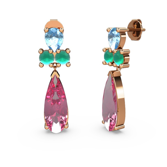 Pembe kuvars, akuamarin ve kök zümrüt 18 ayar rose altın küpe