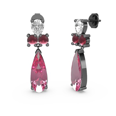 Pembe kuvars, beyaz zirkon ve kök yakut 925 ayar siyah rodyum kaplama gümüş küpe