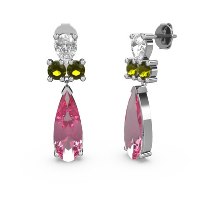 Pembe kuvars, beyaz zirkon ve peridot 8 ayar beyaz altın küpe