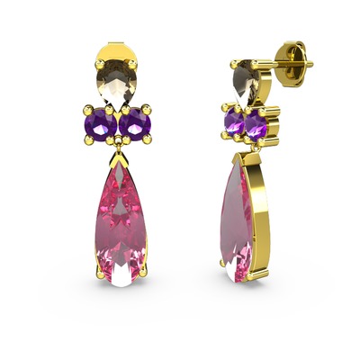Pembe kuvars, dumanlı kuvars ve ametist 925 ayar altın kaplama gümüş küpe
