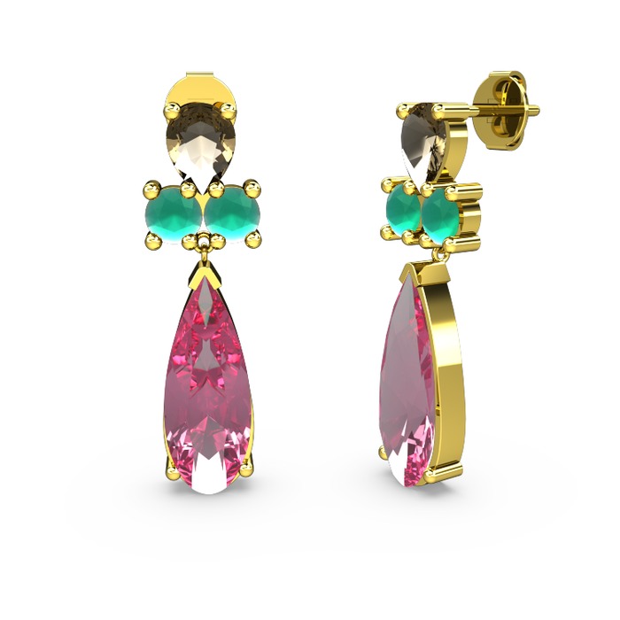Pembe kuvars, dumanlı kuvars ve kök zümrüt 14 ayar altın küpe