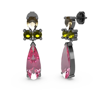 Pembe kuvars, dumanlı kuvars ve peridot 925 ayar siyah rodyum kaplama gümüş küpe