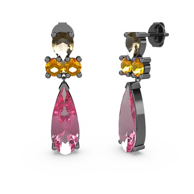 Pembe kuvars, dumanlı kuvars ve sitrin 925 ayar siyah rodyum kaplama gümüş küpe