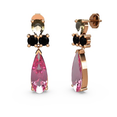 Pembe kuvars, dumanlı kuvars ve siyah zirkon 18 ayar rose altın küpe