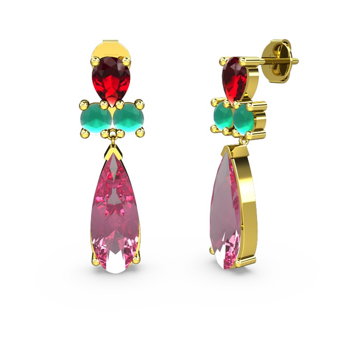 Pembe kuvars, garnet ve kök zümrüt 14 ayar altın küpe