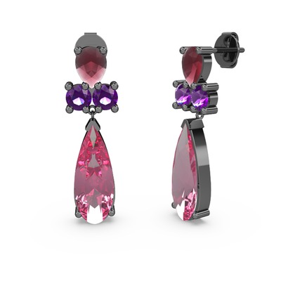 Pembe kuvars, kök yakut ve ametist 925 ayar siyah rodyum kaplama gümüş küpe