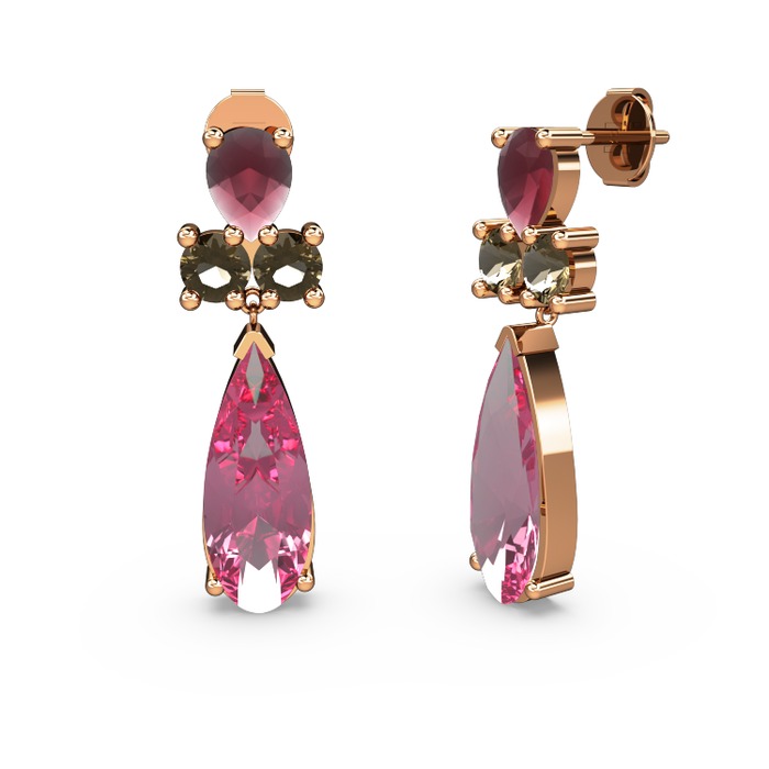 Pembe kuvars, kök yakut ve dumanlı kuvars 18 ayar rose altın küpe