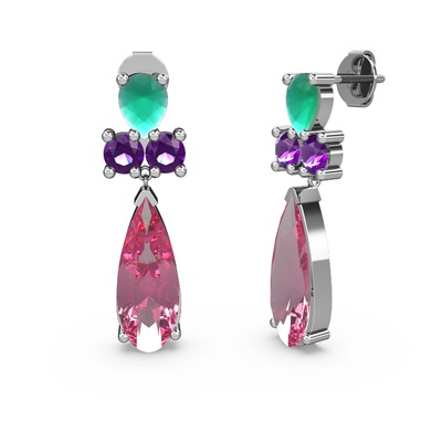 Pembe kuvars, kök zümrüt ve ametist 18 ayar beyaz altın küpe