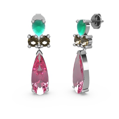 Pembe kuvars, kök zümrüt ve dumanlı kuvars 18 ayar beyaz altın küpe
