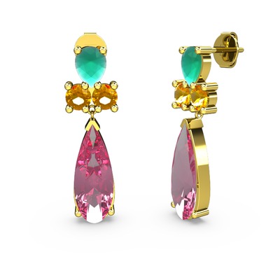 Pembe kuvars, kök zümrüt ve sitrin 925 ayar altın kaplama gümüş küpe