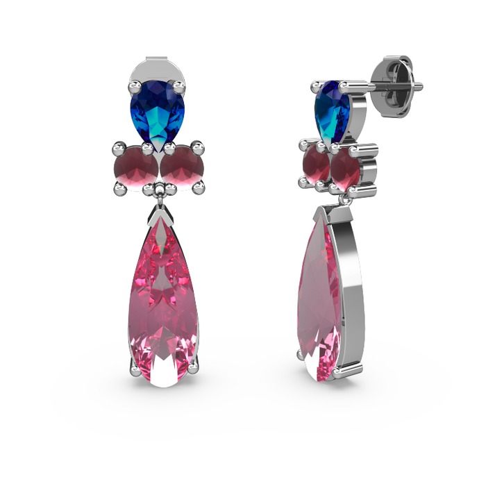 Pembe kuvars, lab safir ve kök yakut 18 ayar beyaz altın küpe
