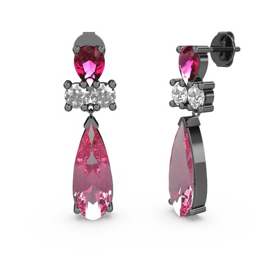 Pembe kuvars, rodolit garnet ve beyaz zirkon 925 ayar siyah rodyum kaplama gümüş küpe