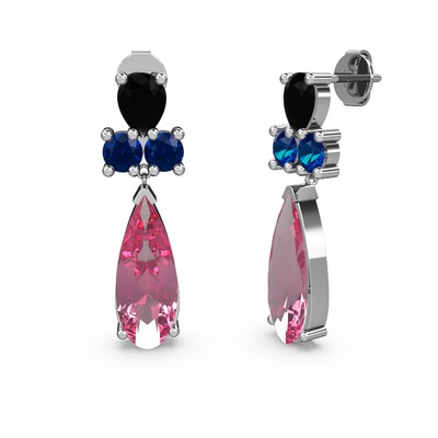 Pembe kuvars, siyah zirkon ve lab safir 18 ayar beyaz altın küpe